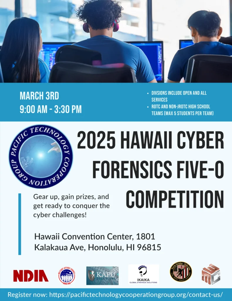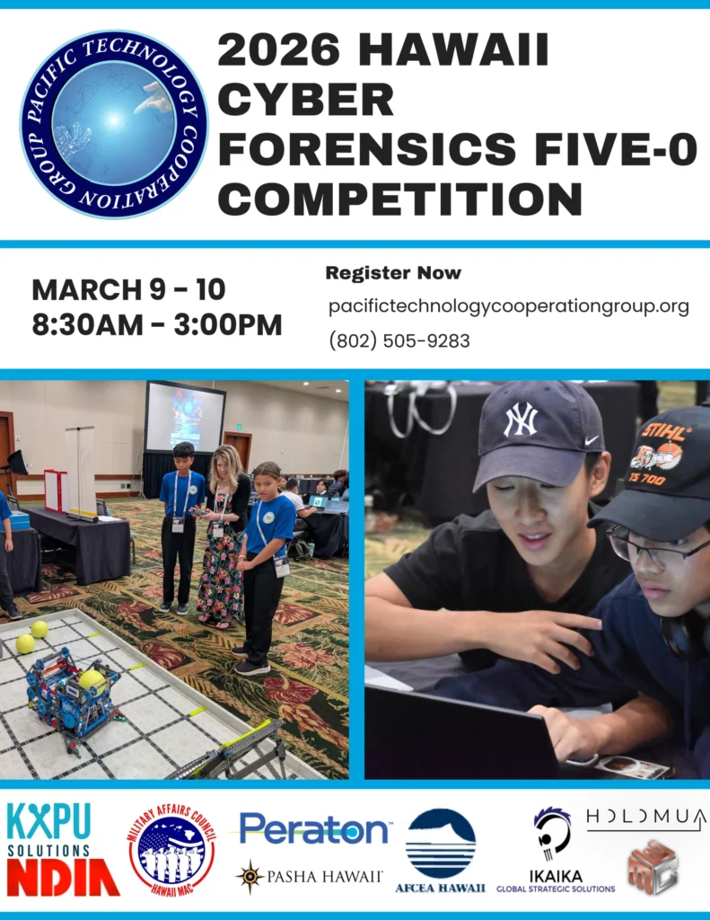 The Pacific’s premier high school cyber forensics competition. Students from across Hawaii and the Pacific are thrust into a simulated cybercrime scene to secure vulnerable systems, prevent further damage, and race against the clock to claim the title of top cyber forensics champion.